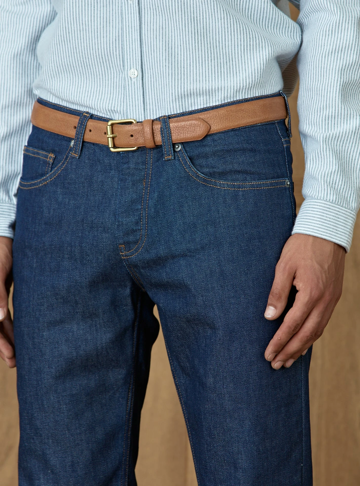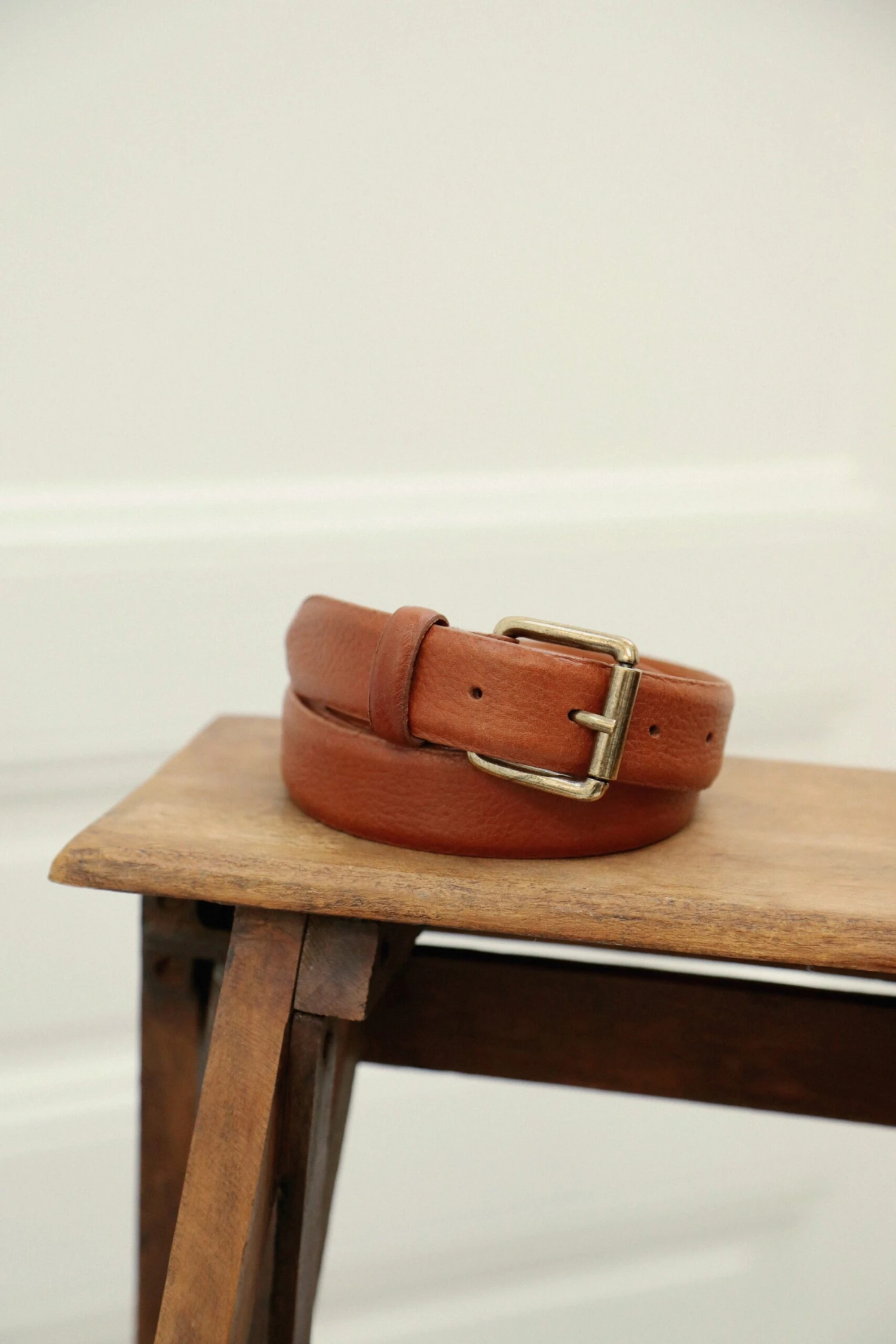 La ceinture Charles se distingue par son cuir pleine fleur au tannage vĂ©gĂ©tal. Ce procĂ©dĂ© traditionnel plus respectueux de l’environnement confère au cuir cognac une patine unique au fil du temps. AgrĂ©mentĂ©e d’une discrète boucle en laiton, elle assure un maintien Ă©lĂ©gant de la taille.