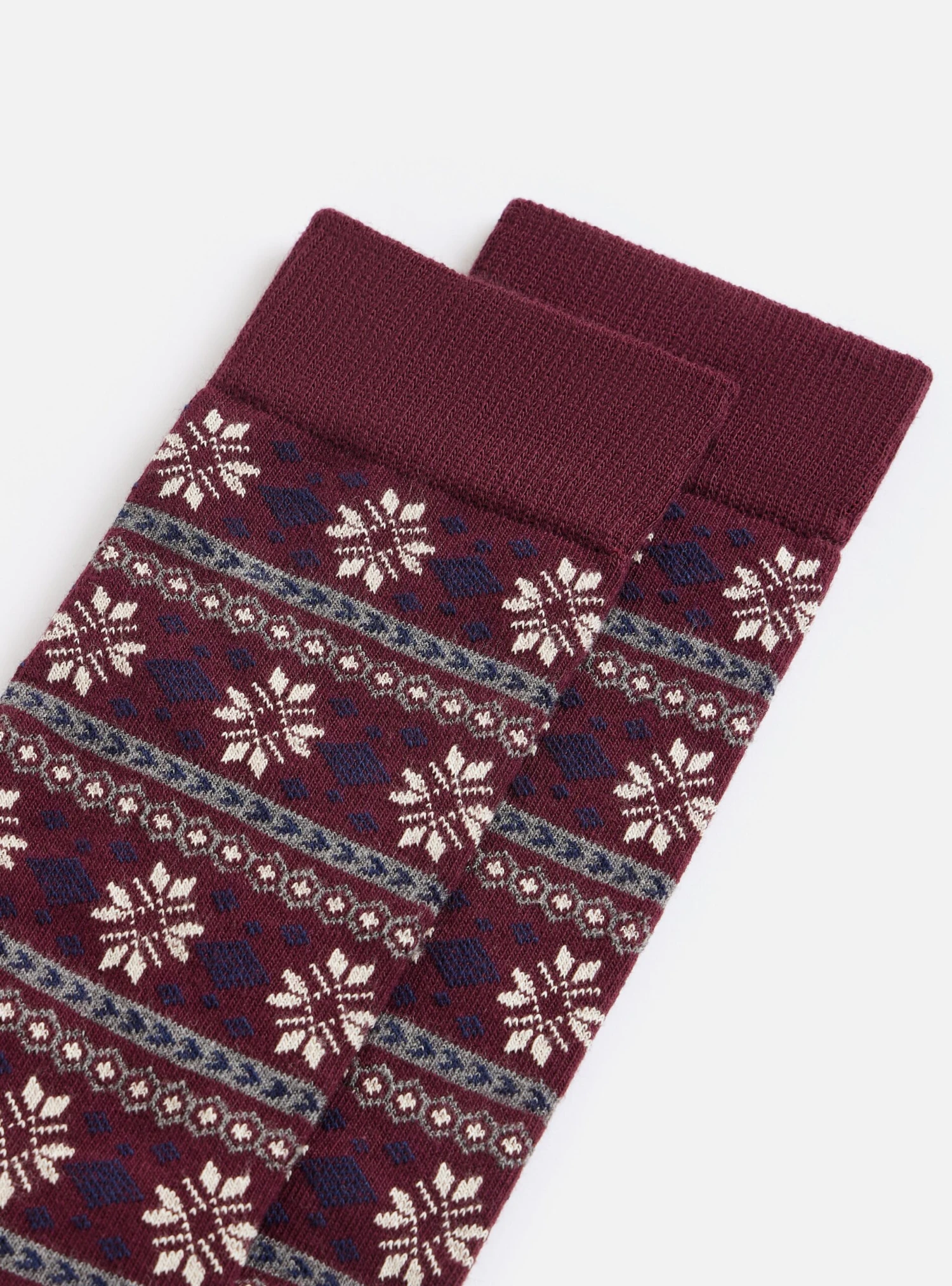Confortables et colorées, les chaussettes mi-hautes Billy sont renforcées au niveau de la pointe et du talon. Elles sont déclinées dans un motif jacquard sur fond bordeaux.