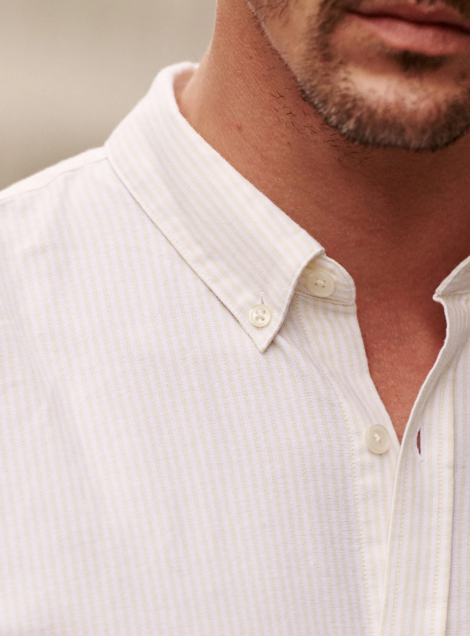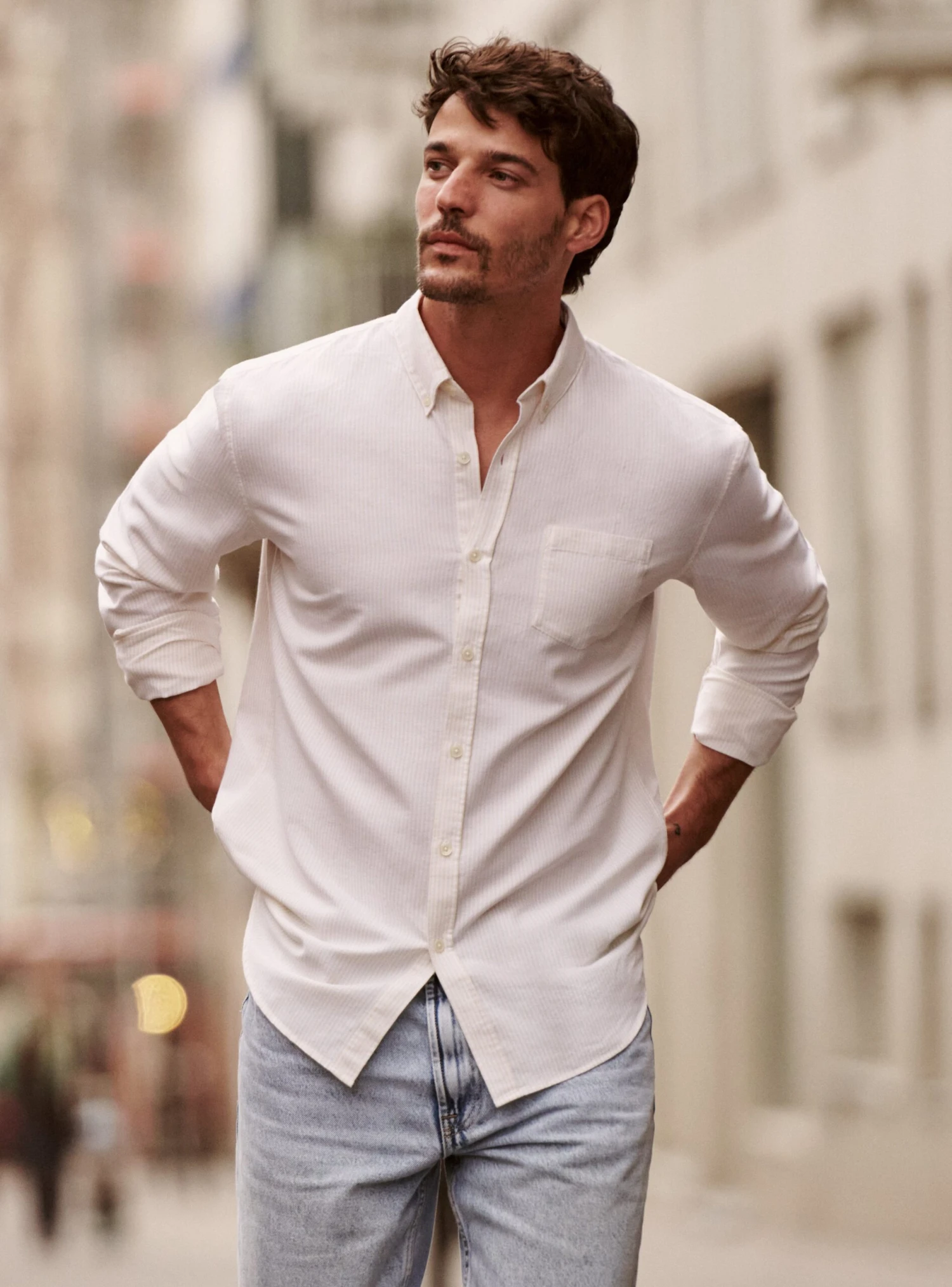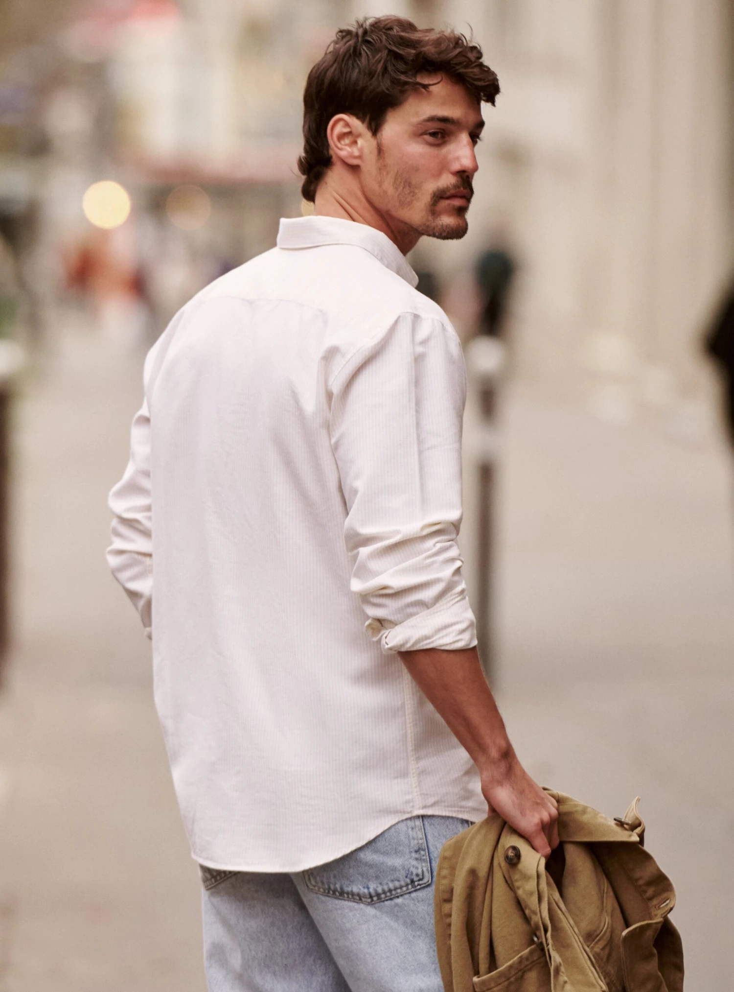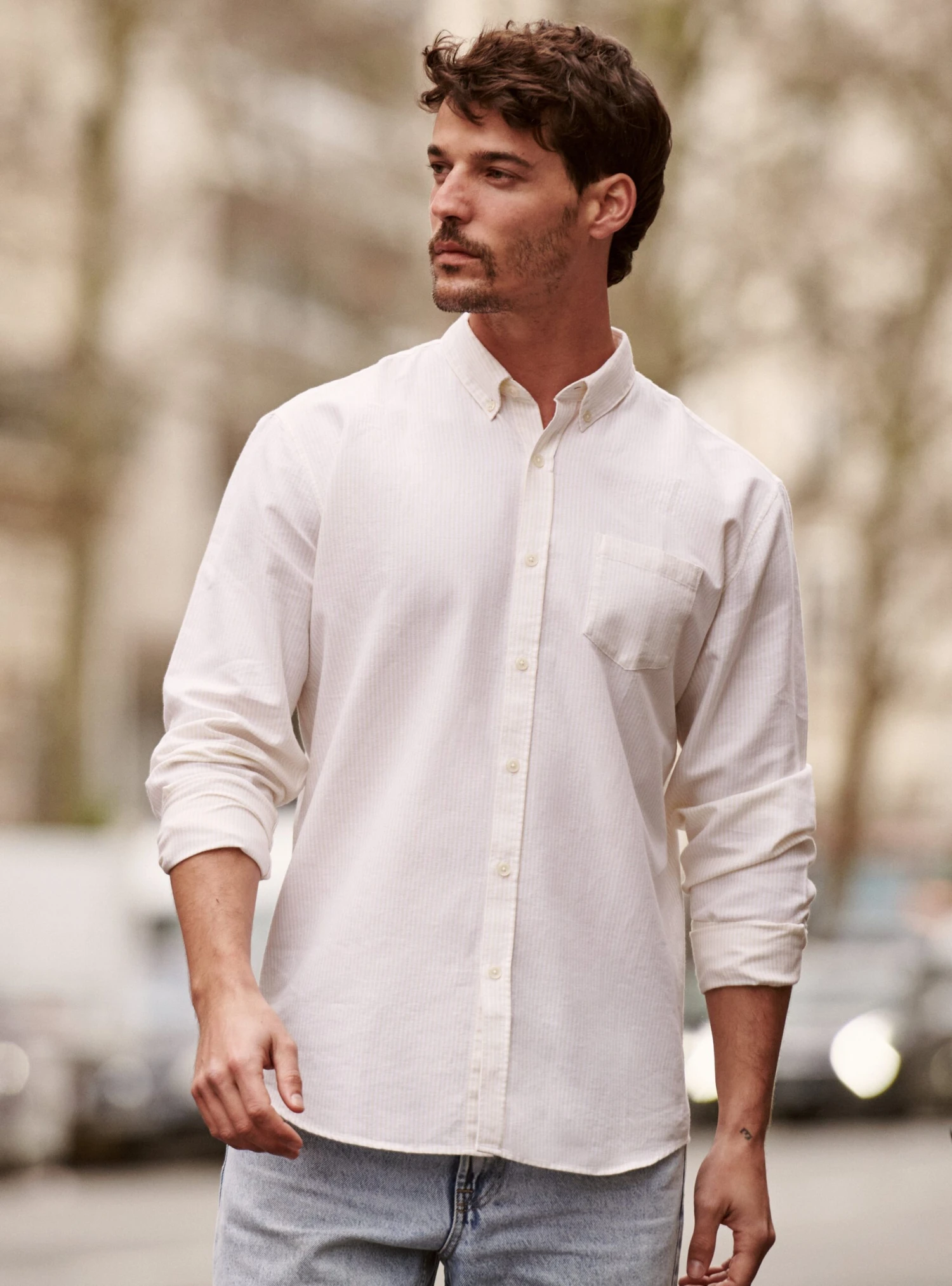 La chemise Tribeca, avec sa coupe ajustée et son col français boutonné, offre un équilibre parfait entre sophistication et décontraction. Avec son tissu Oxford rayé, c’est une pièce essentielle pour les looks printaniers.