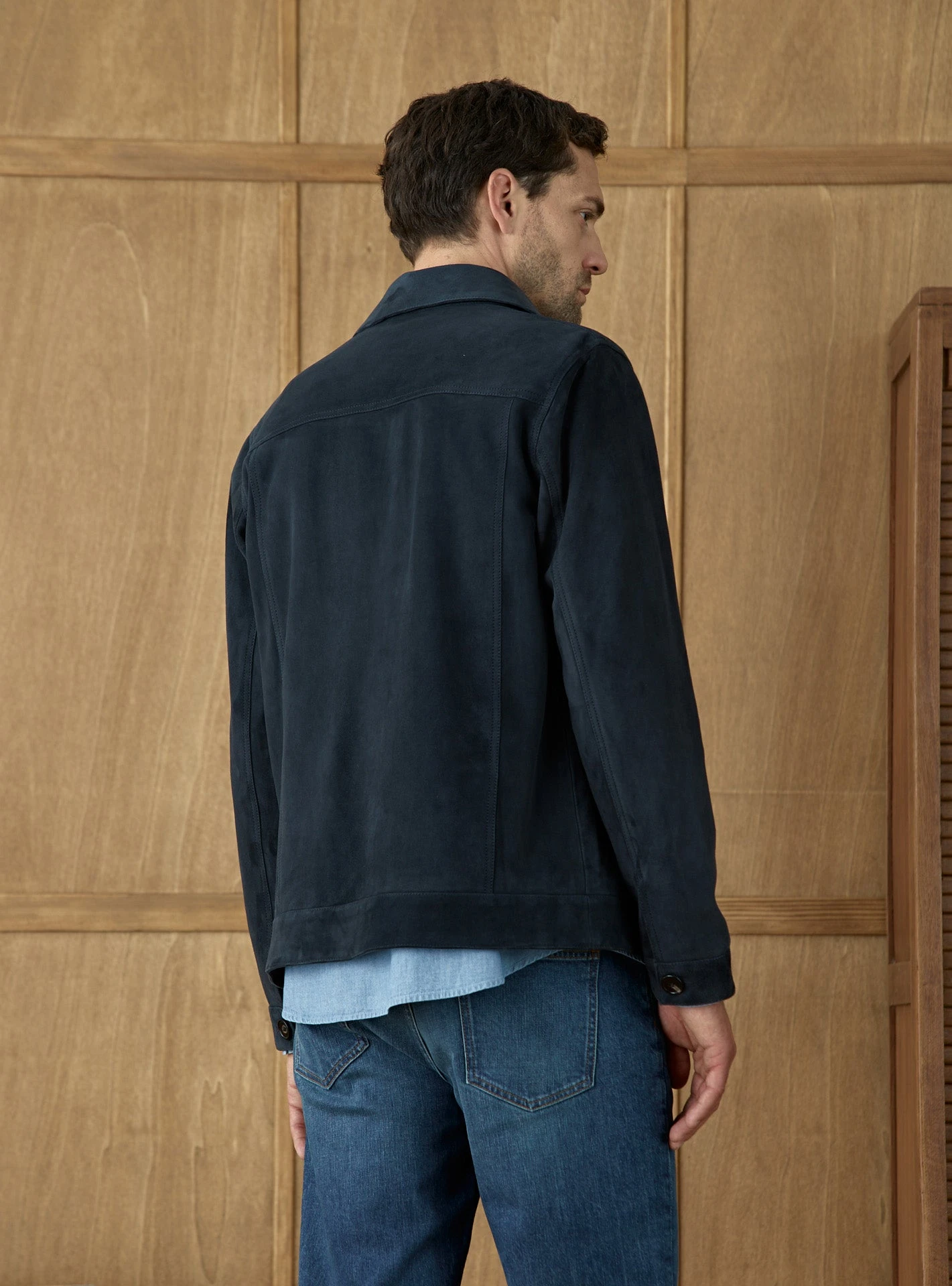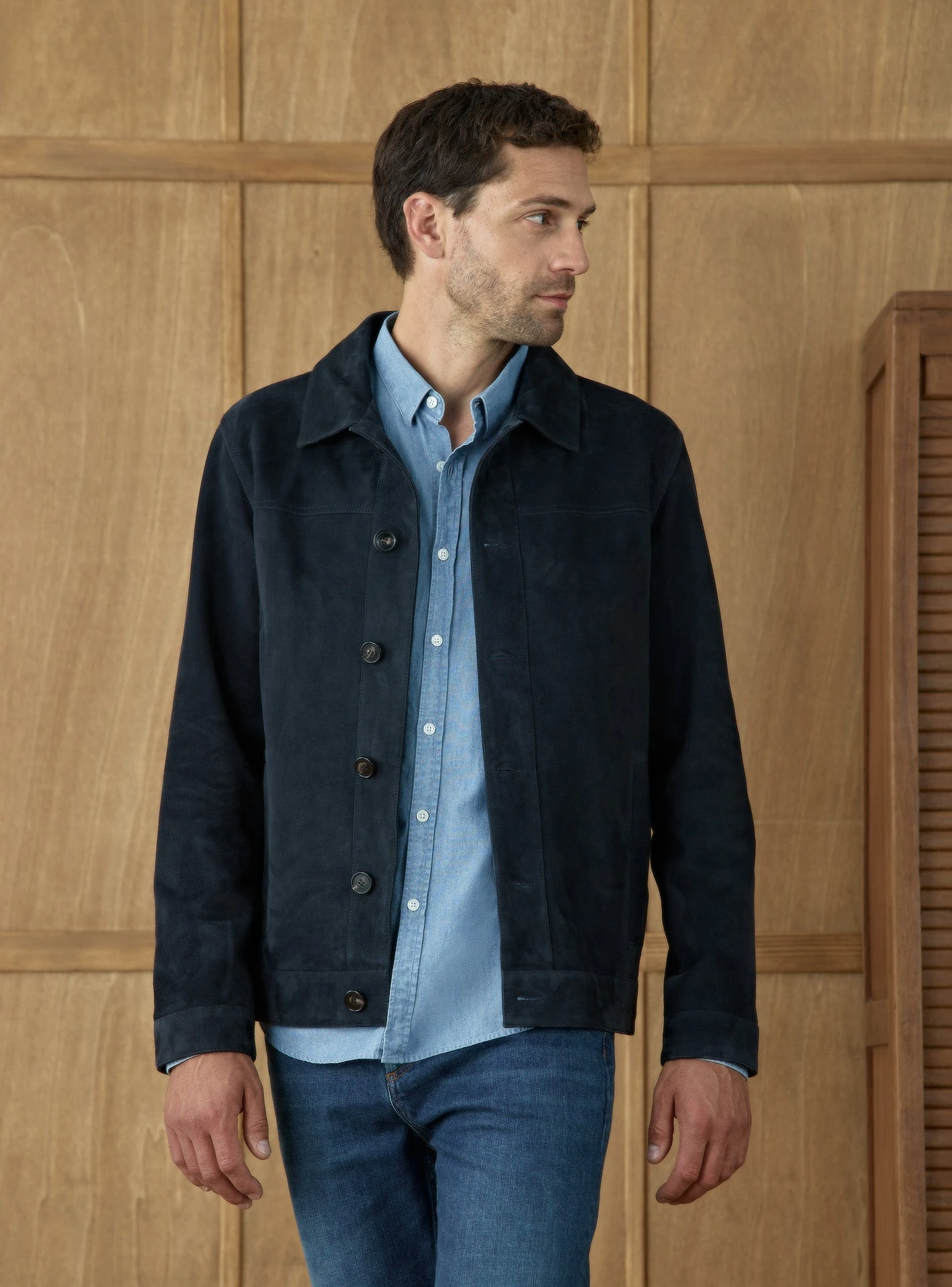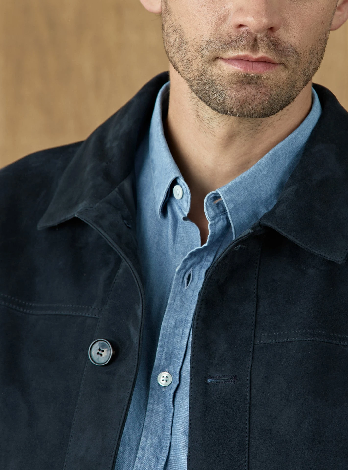 Déclinée dans une teinte bleu nuit, le cuir Simon emprunte à la veste workwear ses lignes droites.