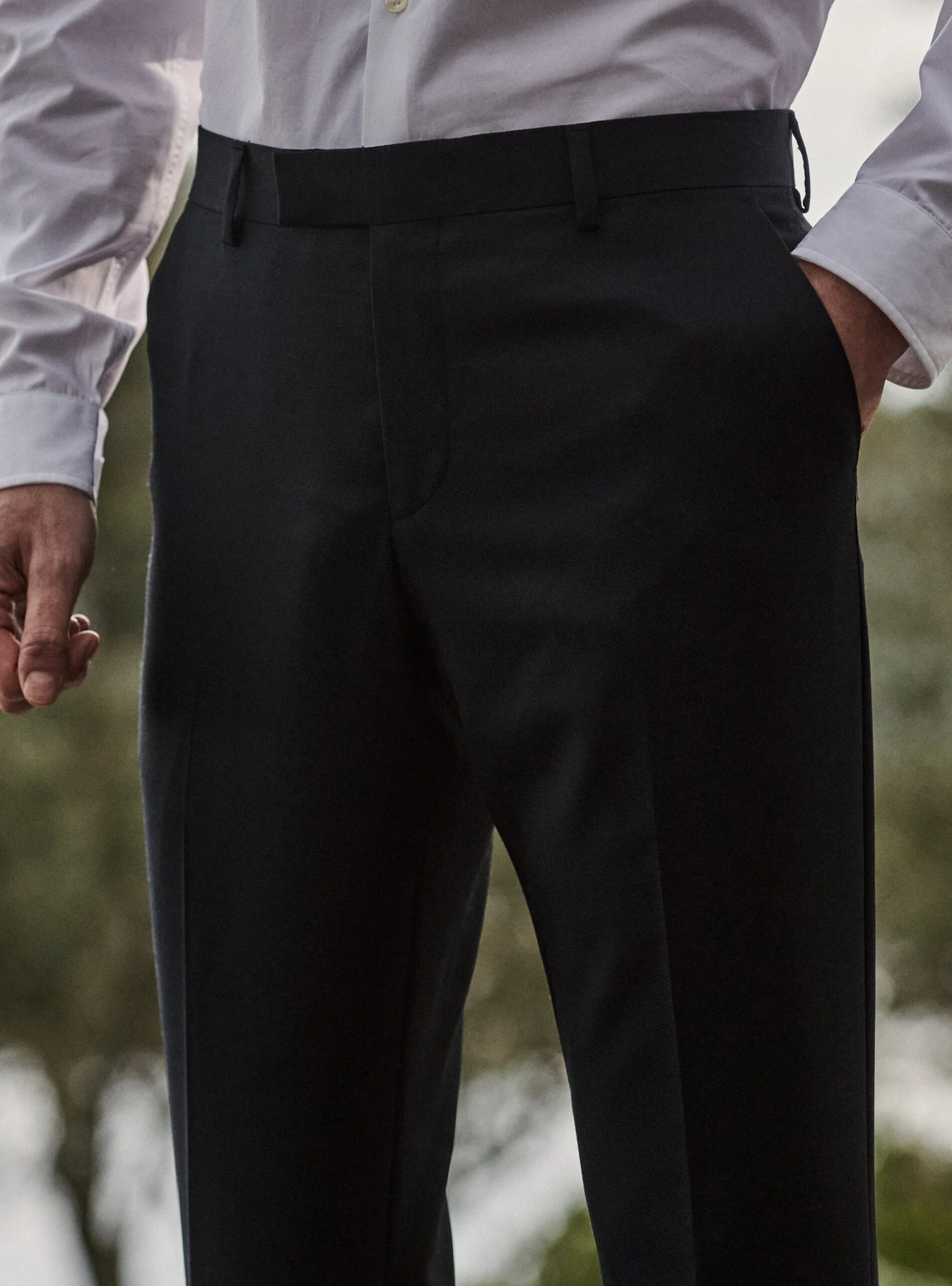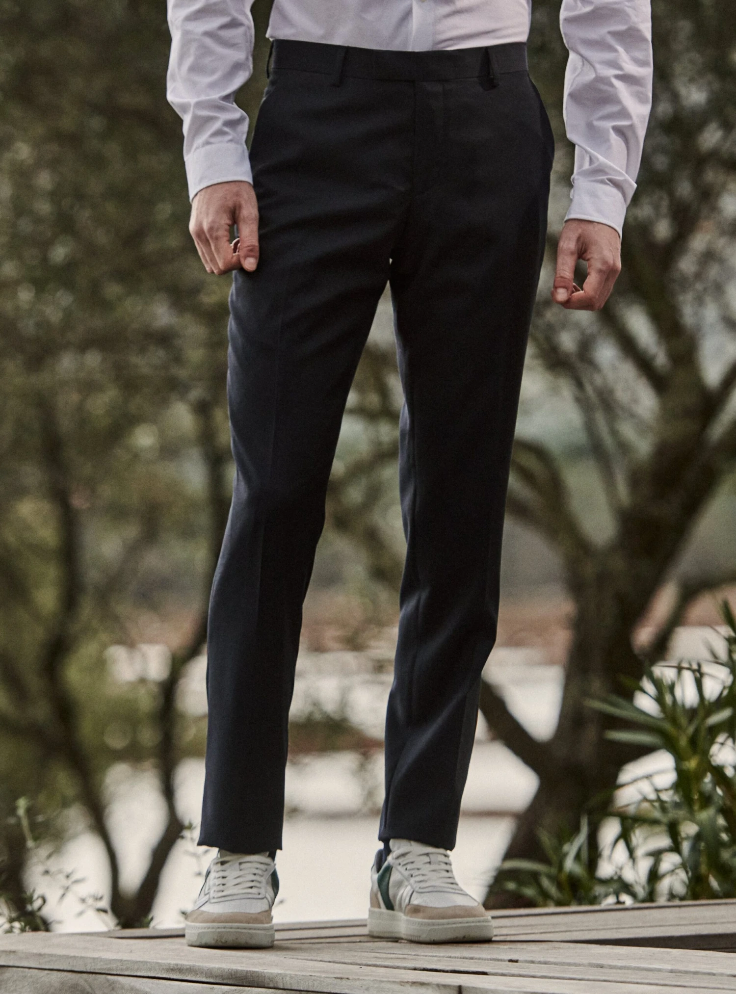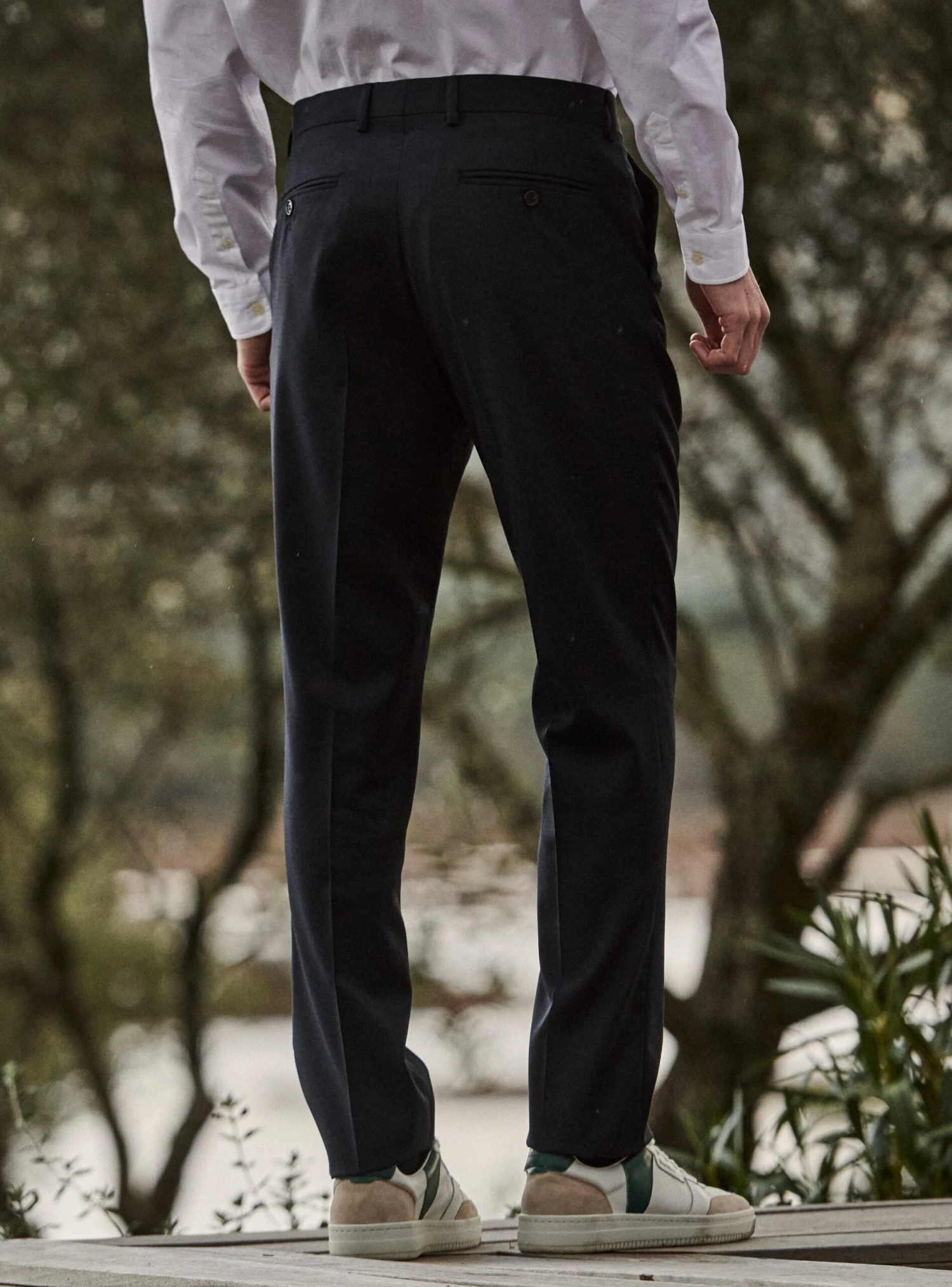 Le pantalon de costume droit ans pince Gekko marine est une valeur sûre. Ses deux poches italiennes et son pli cassé sur le devant de la jambe en font un modèle à la ligne épurée et sa matière 100% laine vierge le rendent ultra confortable à porter.