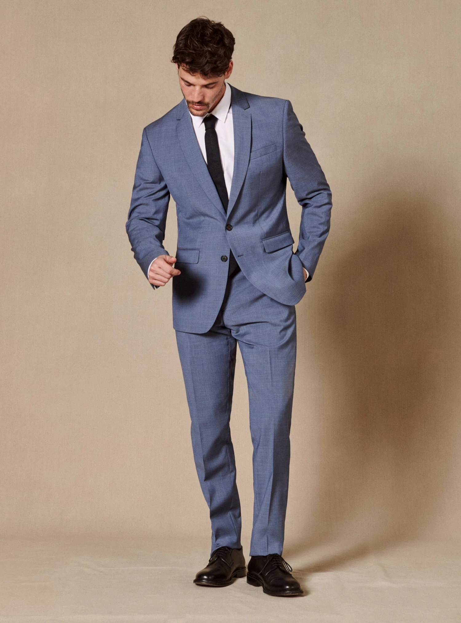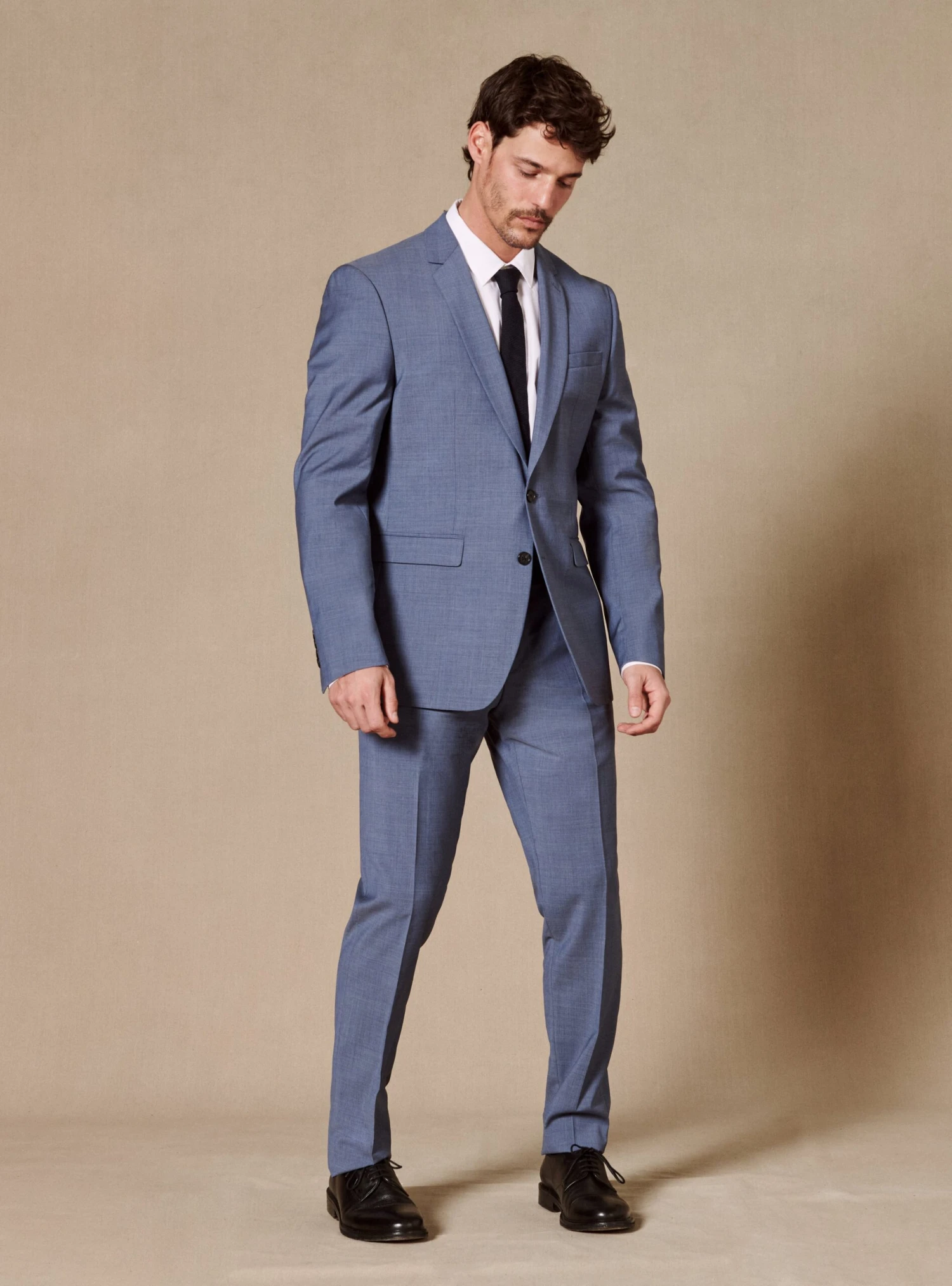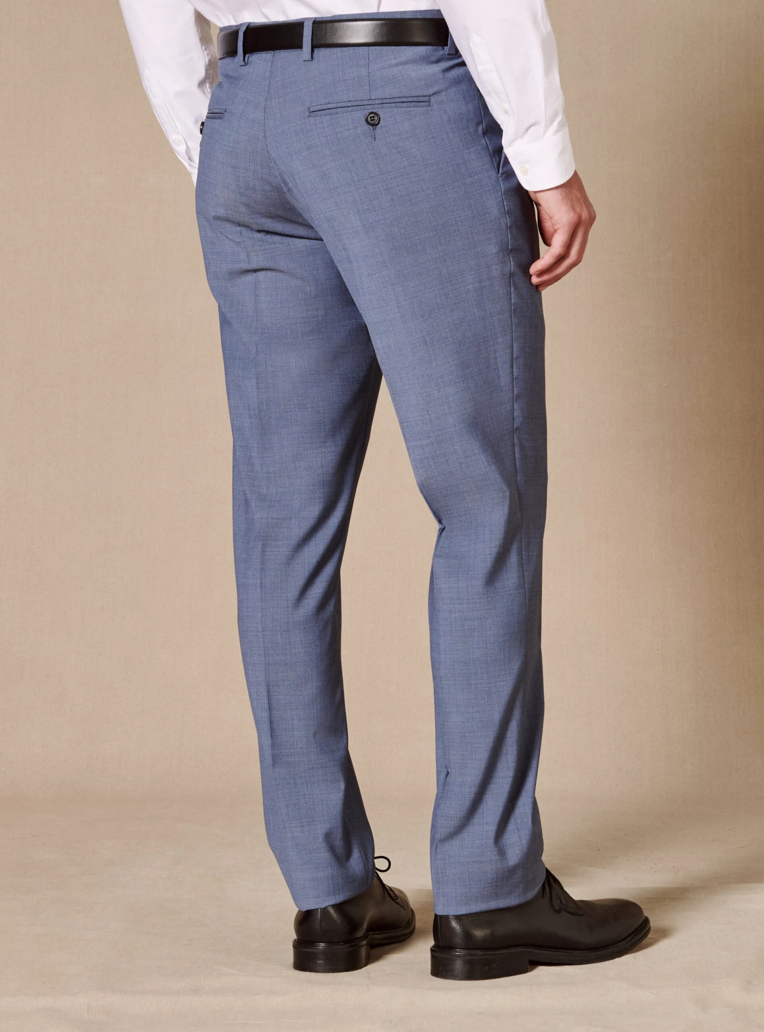 Pantalon de costume sans pince doté d’un pli cassé et d’une finition à la taille appelé « hausse de ceinture » qui confère un look impeccable et assure un maintien sans égal. Confectionné à partir de laine vierge, il se décline en coloris celeste pour s’accorder à la veste Jones.