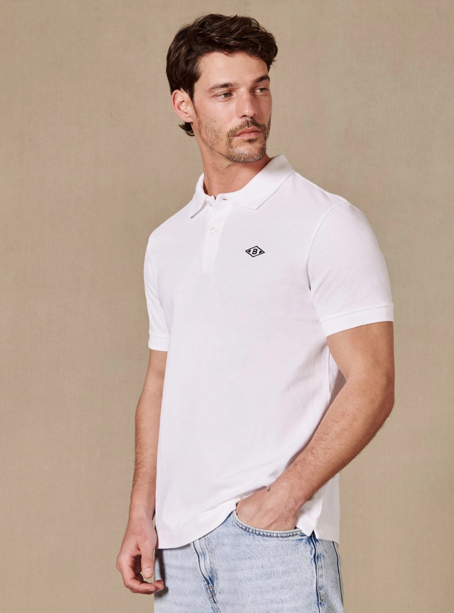L’intemporel Polo blanc en piqué de coton bio ultra doux se décline dans une version avec le logo « B » brodé à la poitrine pour accentuer son côté sportswear.